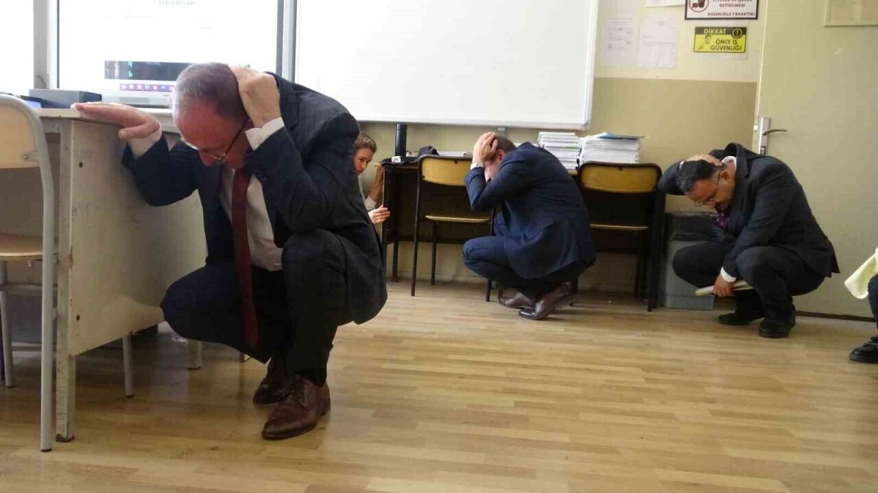 Antalya İl Milli Eğitim Müdürü Mehmet Yasin Eriş, sınıfları ziyareti sırasında çalan deprem alarmı ile öğrencilerle birlikte ‘Çök-Kapan-Tutun’ taktiği ile masaların altına girerek gerekli tedbiri aldı. Tatbikat gereği oluşturulan simülasyonda okulda görevli öğrenciler depremin sona ermesi ile birlikte okulun tahliyesi için tek tek sınıflara girerek öğrencileri yönlendirdi. Kısa sürede öğrencilerin okul bahçesinde toplanmasının ardından sınıf öğretmenleri tarafından sayım yapılarak eksik ve yaralı öğrenci olup olmadığı kontrol edildi. Bu sırada deprem sırasında yaralan bir öğrenciyi temsil eden cansız manken görevli öğrenciler tarafından sedye ile taşınarak sağlık ekiplerine teslim edildi.