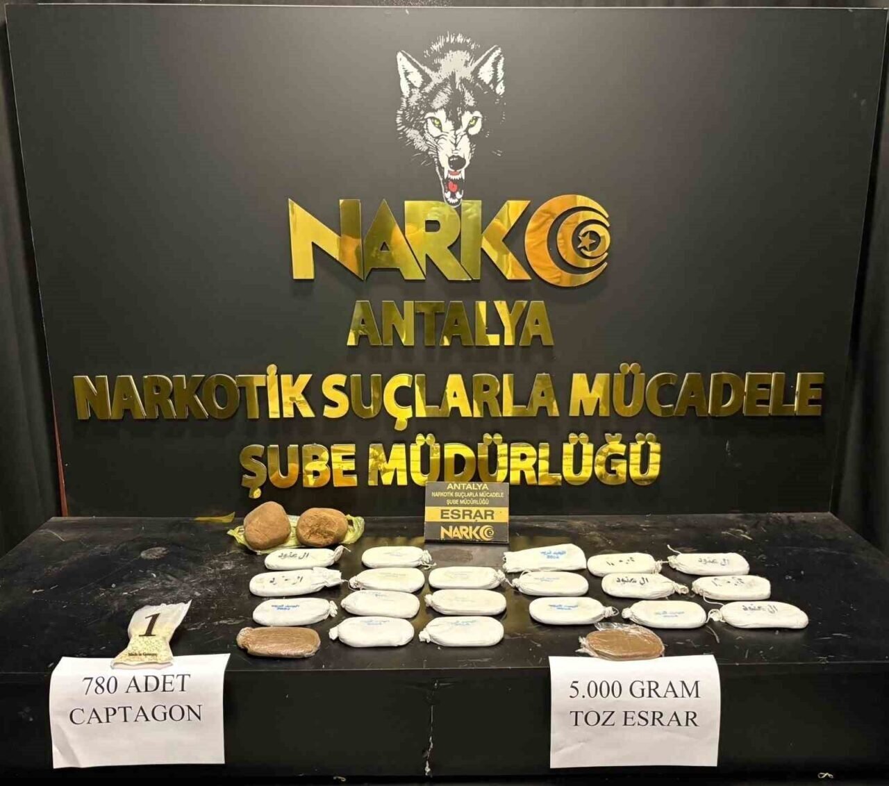 Antalya İl Emniyet Müdürlüğü Narkotik Suçlarla Mücadele Şube Müdürlüğü koordinesinde, il genelinde son 1 haftada uyuşturucu suçlarına yönelik operasyonlar gerçekleştirildi. Yapılan çalışmalarda; 15 kilogram esrar, 780 adet captagon hap, 189 adet sentetik ecza, 144 gram kokain, 69 adet ve yaklaşık 14 bin 838 kullanımlık sentetik kannabinoid (A4), 35 gram metamfetamin, 11 gram eroin, 2 hassas terazi, 5 adet ateşli silah, 13 adet fişek, suçtan elde edildiği değerlendirilen bir miktar döviz ve Türk Lirası ele geçirildi. Ayrıca yapılan operasyonlar kapsamında; ’’uyuşturucu veya uyarıcı madde ticareti yapmak ve sağlamak’’ suçundan 22 olayda 28 şüpheli yakalandı, 19’u tutuklandı. ’’Kullanmak için uyuşturucu veya uyarıcı madde satın almak, kabul etmek ve bulundurmak’’ suçundan ise 140 olayda 142 kişi gözaltına alındı. Uyuşturucu suçlarından aranan 21 şahıs yakalanarak, 14’ü cezaevine teslim edildi. Aynı zamanda, uyuşturucuyla mücadelede önleyici faaliyetler kapsamında, 3 bin 387 anne ve anne adayına eğitim verilerek farkındalık çalışmaları gerçekleştirildi.