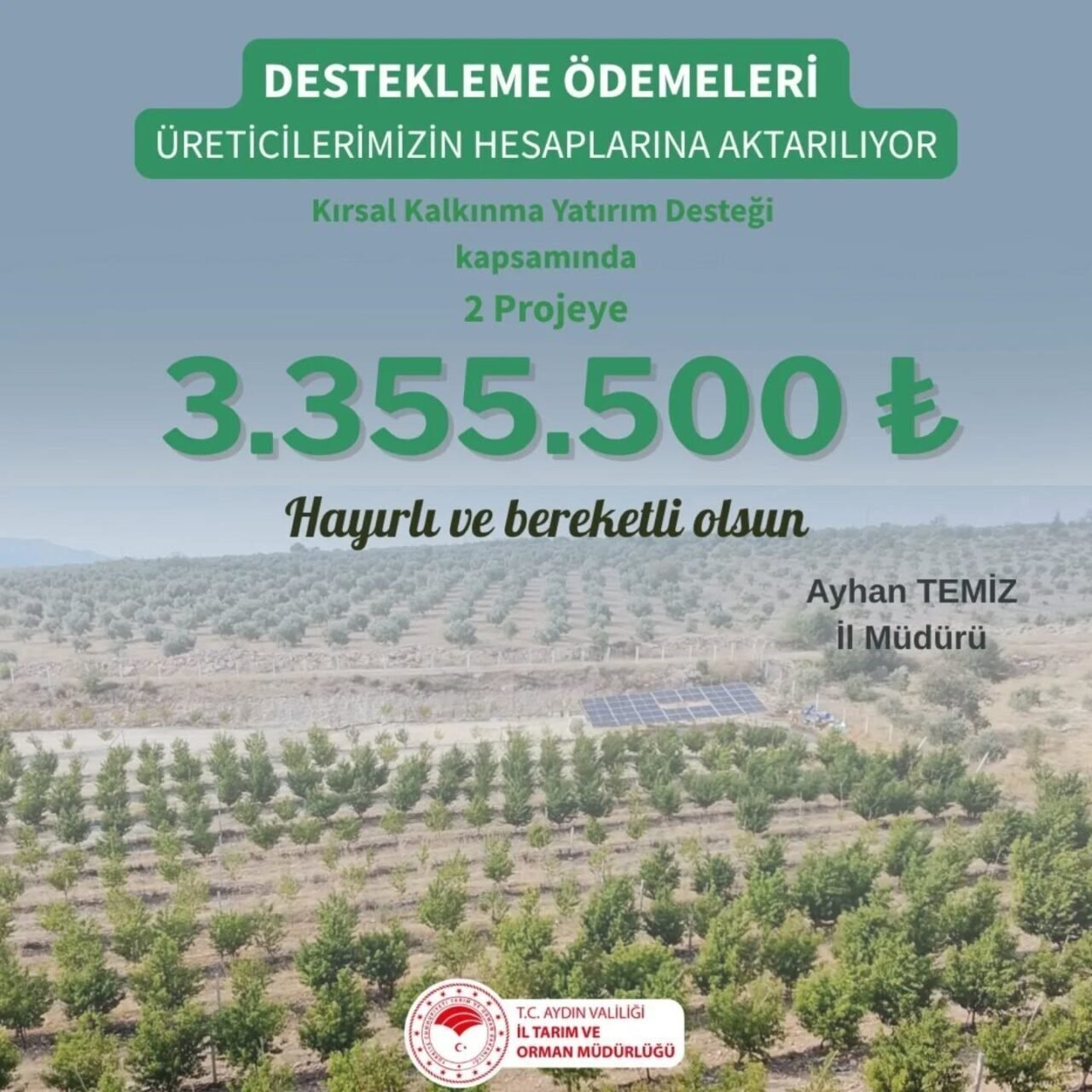 Aydın İl Tarım ve Orman Müdürlüğü, Kırsal Kalkınma Yatırımları Destekleme Programı kapsamında 2 projeye toplam 3 milyon 355 bin 500 TL destek ödemesi yaparak üreticilerin hesaplarına aktardı.