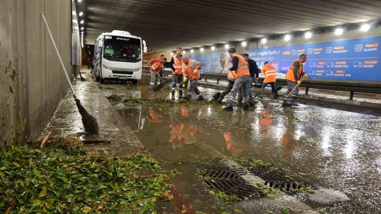 Aniden etkili olan sağanak yağışın ardından Antalya Büyükşehir Belediyesi ASAT Genel Müdürlüğü ekipleri de kısa sürede sahaya indi. Kentin farklı noktalarından gelen ihbarlara hızla müdahale eden ekipler, ana arterler başta olmak üzere dolu yağışı nedeniyle dökülen ve yağmur sularının taşıdığı yaprakların tıkadığı mazgalları temizlendi. Ekiplerinin en yoğun çalışması ise alt geçitlerde oldu. ASAT ekipleri ile Çevre Koruma ve Kontrol Dairesi Başkanlığı ekipleri aşırı yağış nedeniyle polis tarafından trafiğe kapatılan Falez Alt Geçidi’nin trafiğe açılması için temizlik çalışması yaptı. Yoğun bir çalışmayla hızla tamamlanan temizliğin ardından alt geçit kısa süre sonra trafiğe açıldı.
