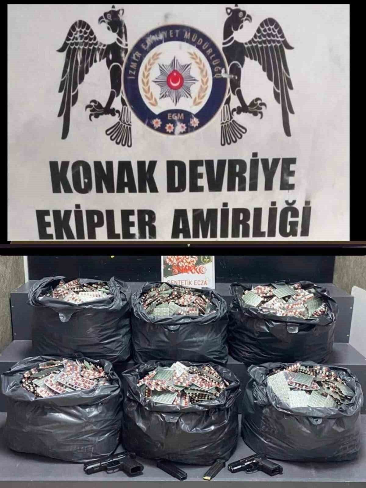 İzmir’in Konak ilçesinde düzenlenen operasyonda 42 bin 500 adet uyuşturucu hap ile 2 ruhsatsız tabanca ele geçirildi.