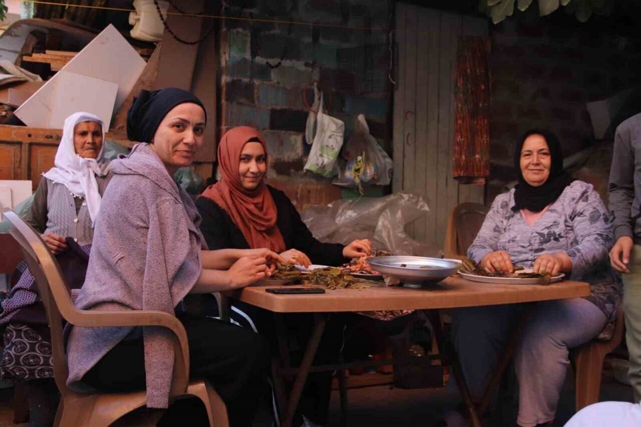 Turgutlu ilçesi Selvilitepe Mahallesinde bir araya gelen mahalle sakinleri toplandıkları bir komşularını evinin bahçesinde sarma sararak Gazze’ye destek amaçlı düzenlenen hayır panayırlarına gönderiyor.