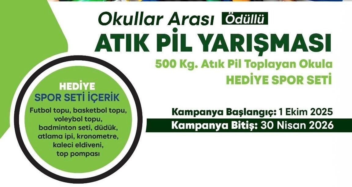 Yarışma sonunda toplamda 500 kilogram ve üzeri atık pil toplamayı başaran okullar, spor seti ödülü kazanacak. Bu setler; futbol, basketbol ve voleybol topları, badminton seti, düdük, atlama ipi, kaleci eldiveni gibi spor malzemelerinden oluşacak.